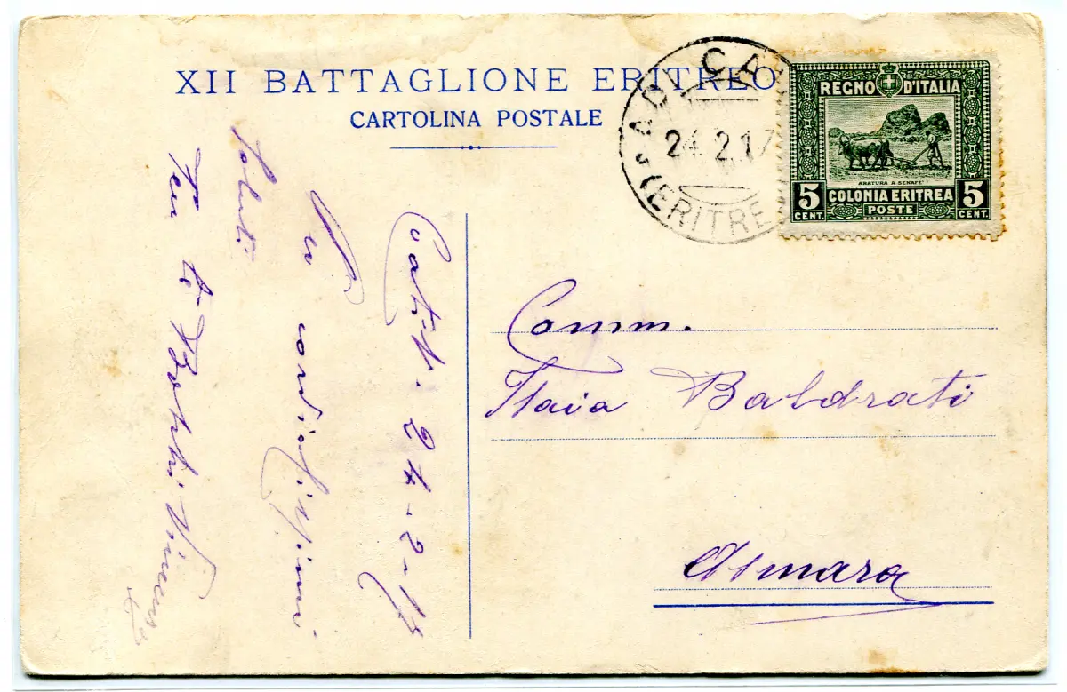 Eritrea Adi Caiè - Postkarte des XII. Eritrea-Bataillons AK - Eritrea Adi Caiè - Postkarte des XII. Eritrea-Bataillons frankiert mit ca. 5 Nr. 34 verschickt von Adi Caiè nach Asmara am 24.2.17 - Ungewöhnlicher Abfahrtsort und isolierte Nutzung Cod. 1014/16