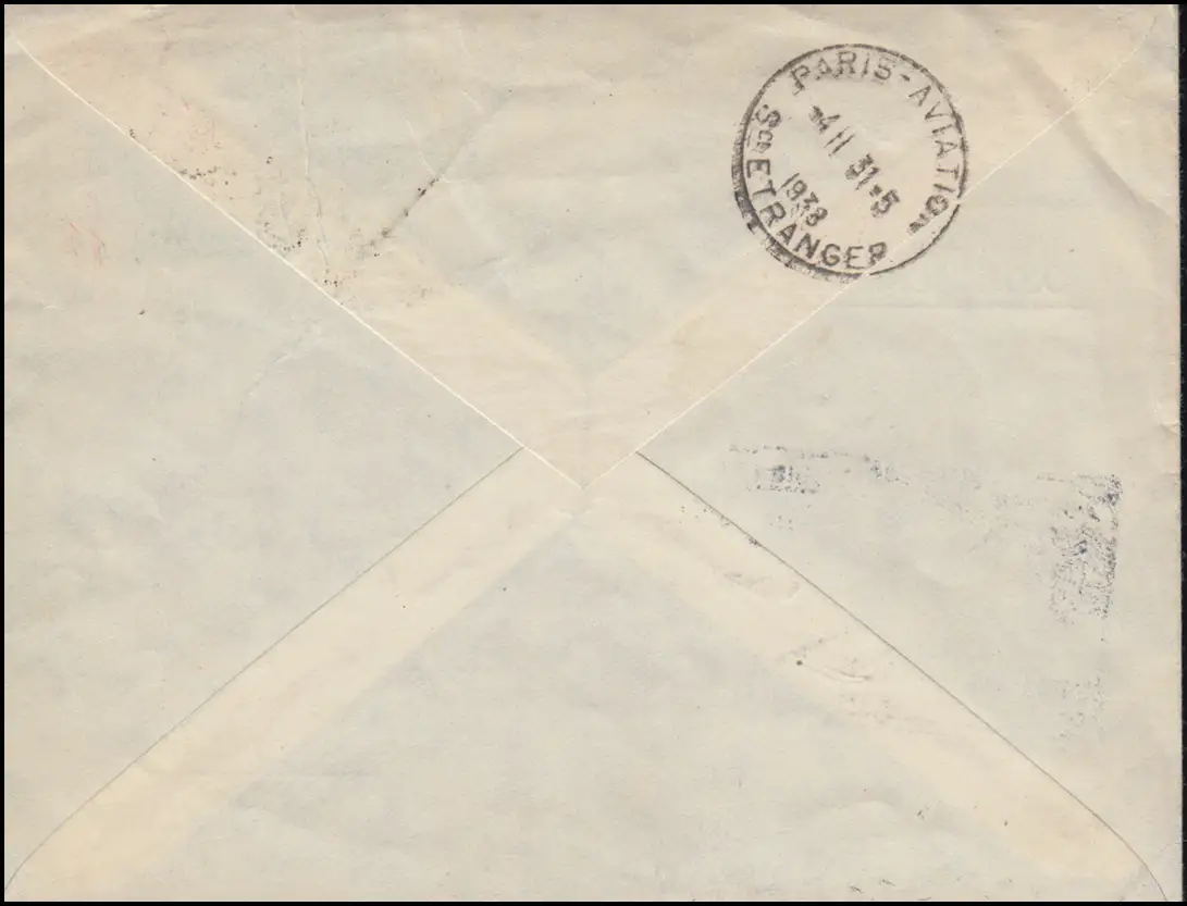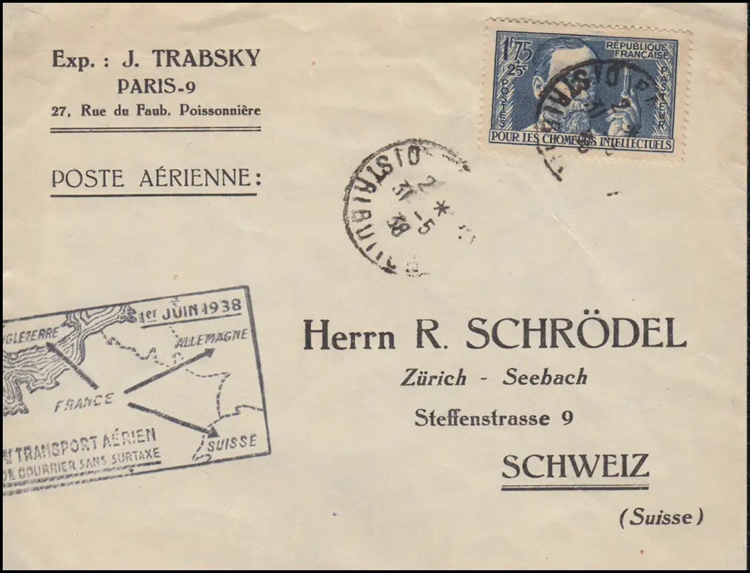 Beförderungsstempel über Paris Flughafen 31.5.1938 nach Zürich in die Schweiz