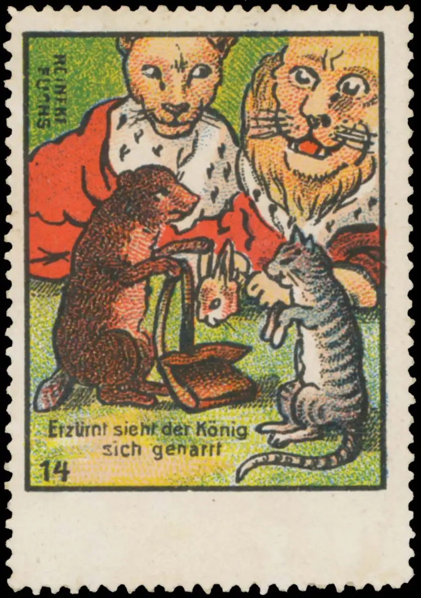 Reineke Fuchs, 14, Märchen, Katze, Bär, Löwe, Größe/Zustand: 5x4 , guter Zustand, Original alte Reklamemarke die seinerzeit für die Werbung benutzt wurde