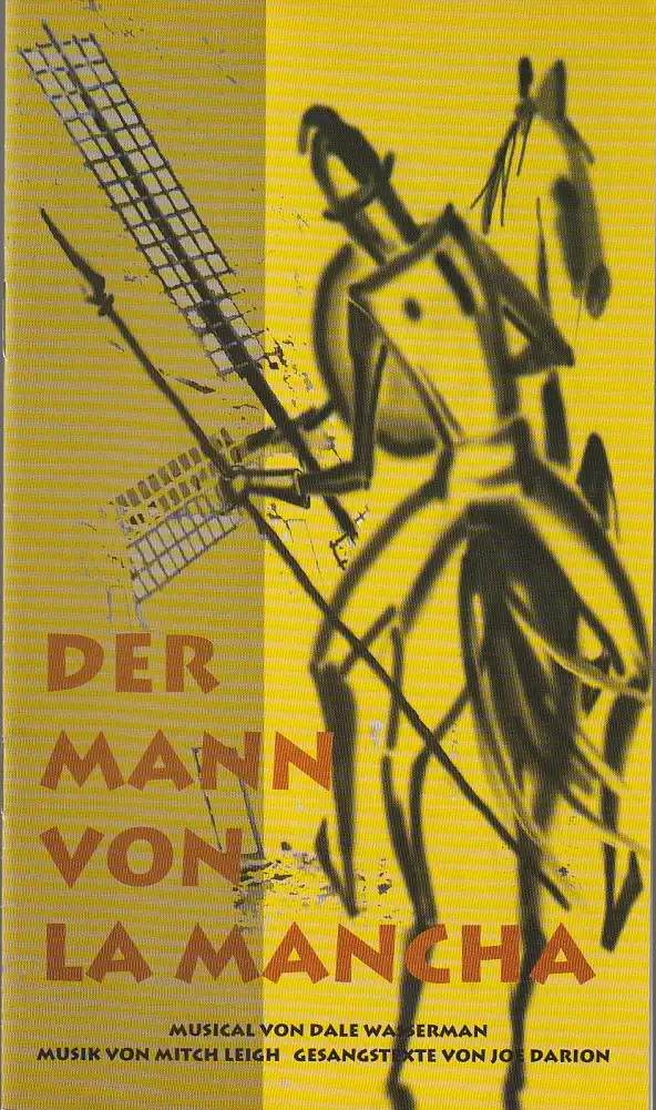 Ein Musical von Dale Wassermann. Gesangstexte von Joe Darion. Inszenierung: Hans Hermann Krug. Musikalische Leitung: Friedemann Schulz. Ausstattung: Gudrun Müller. Choreographie: Iris Limbarth. Mitwirkende: Wolf-Dieter Gööck, Andre Riemer, Sibylle Wolf, Andreas Scholz, Eugene Amesmann /Michael Heilfort, Leander de Marel, u. a. Das Erzgebirgische Sinfonieorchester Aue. - Theaterprogramm, Opernprogramm, Ballettprogramm, Musicalprogramm, Konzertprogramm, Theatermemorabilia, Programmhefte Sammlung, deutsche Theatergeschichte.