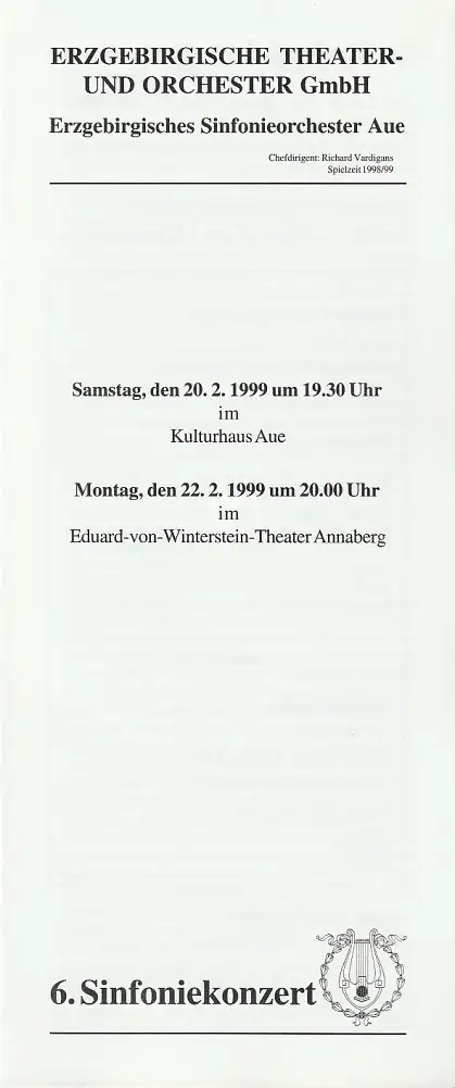 Erzgebirgische Theater- und Orchester GmbH, Erzgebirgisches Sinfonieorchester Aue, Richard Vardigans, Michael Eccarius: Programmheft 6. SINFONIEKONZERT ERZGEBIRGISCHES SINFONIEORCHESTER AUE 20.2.1999 Kulturhaus Aue und 22.2.1999 Eduard-von-Winterstein-The