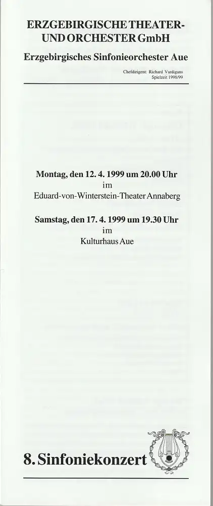 Erzgebirgische Theater- und Orchester GmbH, Erzgebirgisches Sinfonieorchester Aue, Richard Vardigans, Michael Eccarius: Programmheft 8. SINFONIEKONZERT ERZGEBIRGISCHES SINFONIEORCHESTER AUE 12.4.1999 Kulturhaus Aue und 17.4.1999 Eduard-von-Winterstein-The