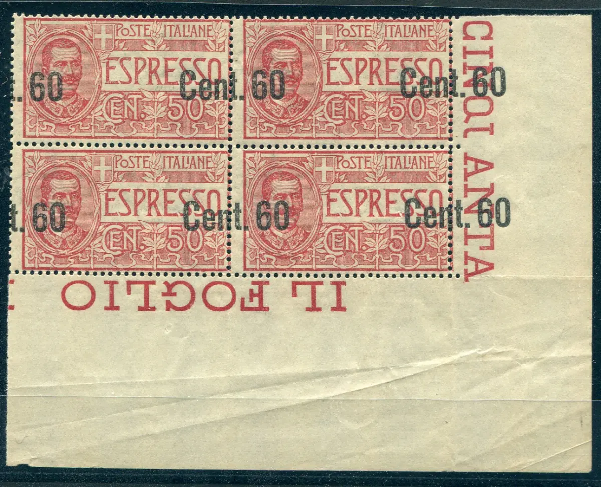 Espresso Cent. 60 von 50 mit stark nach rechts verschobenem Aufdruck Ganzgummi MNH - Espresso Cent. 60 von 50 Nr. 6 Viertel a. von f. mit stark nach rechts verschobenem Aufdruck; zwei Exemplare 60 Cent. (n. 6g) und zwei Exemplare Wert 60 am Rand wiederholt - Selten - Kat. € 2600+ Code 276/11