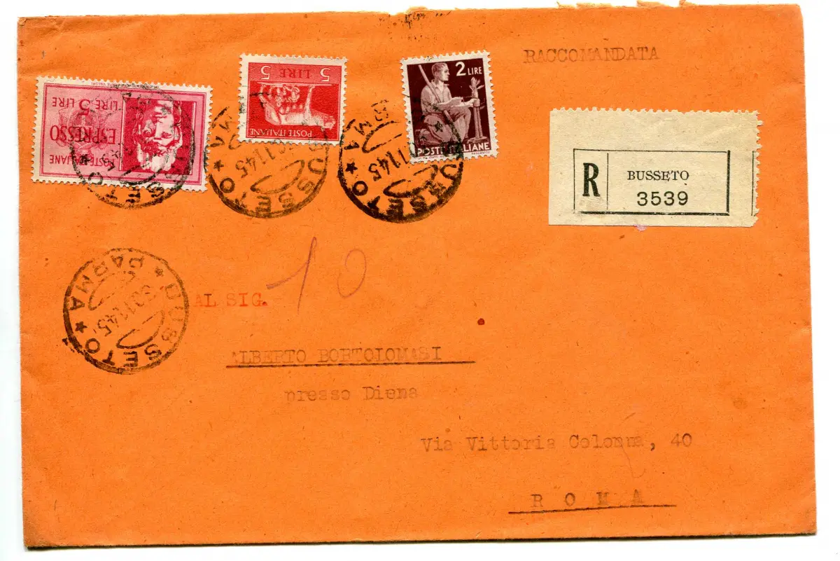 Espresso Lire 5 + Ergänzungen auf Umschlag Racc. da Busseto - Espresso Lire 5 Nr. 24 + ergänzende P.O. Nr. 534 + 552 auf Umschlag von Busseto nach Rom am 30.11.45 - im Tarif Code 380/3