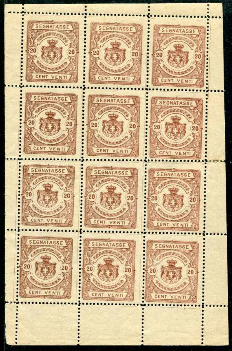 Essay nicht angenommen Cent. 20 braun lila Wappen Savoyen Vollgummi - Essay nicht angenommen Cent. 20 braun lila Wappen Savoyen (Kat. Unikat Nr. 68) - Bogen mit 12 Exemplaren - Selten - Kat. euro 1.200 n. 249/6