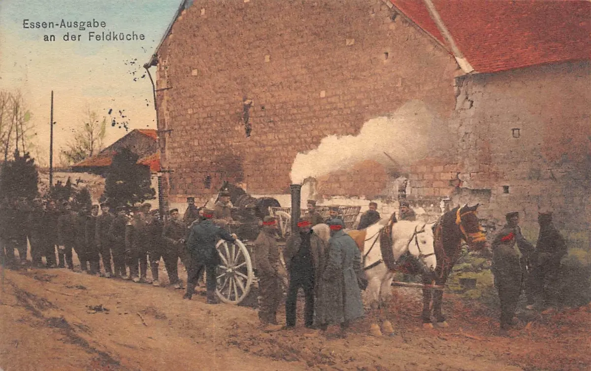 Essen-Ausgabe an der Feldküche Patriotika Postkarte AK 1915