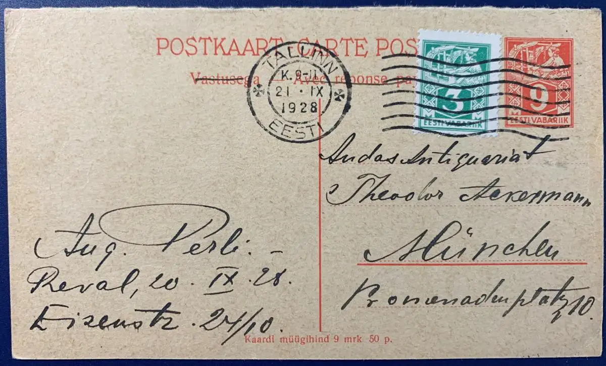 Ganzsache, Postkarte Antwortteil, Mi.Nr. P4 A, Zusatzfrankatur, gelaufen mit Poststempel vom 21.09.1928 von Tallinn nach München.