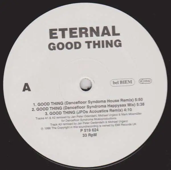 12" Maxi Eternal - Good Thing, neutrales Cover, Zustand Platte VG; Made in United Kingdom 1996 EMI P 519 624, Tracks Dancefloor Syndoma House Remix 5:50, Dancefloor Syndroma Happysax Mix 5:38, JPOs Acoustics Remix 4:10, P's Good Vibrations Mix 5:34, Pulsar X-tended Remix 5:05, Pulsar's RMB 3:42