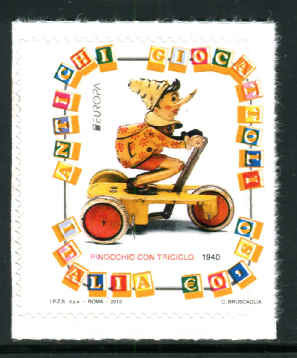 Europa 2015 Pinocchio Sorte mit verschobener Stanzung Vollgummi - Europa 2015 „Pinocchio” Nr. 3567 mit stark waagerecht verschobener Stanzung – die Briefmarke, wenn sie vom Träger gelöst wird, hat keine linken Schriftzüge – Interessant, wenige bekannte Exemplare Code 747/8