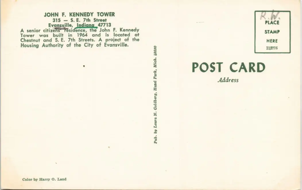 Evansville (Indiana) JOHN F. KENNEDY TOWER Building US Postcard 1965