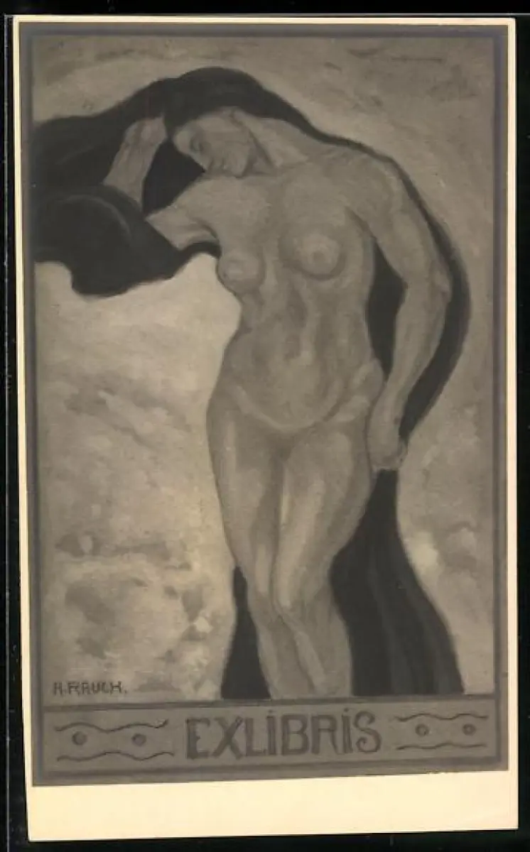 Exlibris A. Rauch, Frauenakt mit langem Haar