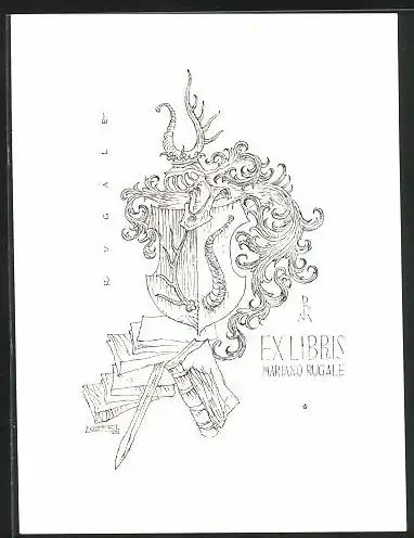 Exlibris Mariano Rugale, Wappen mit Geweih und Ritterhelm