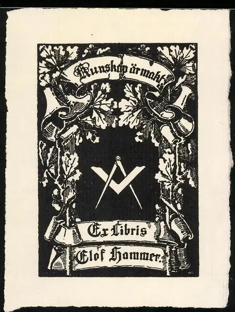 Exlibris Olaf Hammer, Freimaurer Symbole Zirkel und Winkel umgeben von Eichenlaub