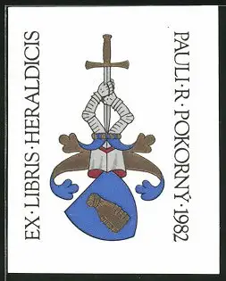 Exlibris Pauli R. Pokorny, 1982, Wappen mit Ritterhelm & Schwert