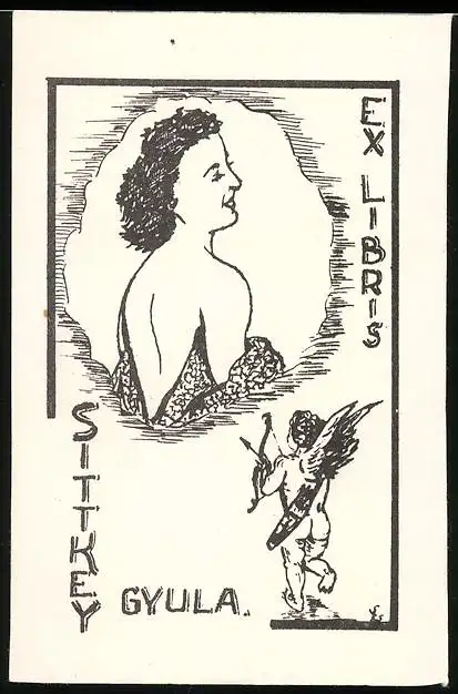 Exlibris Sittkey Gyula, Brünette Dame entkleidet sich, Amor Engel