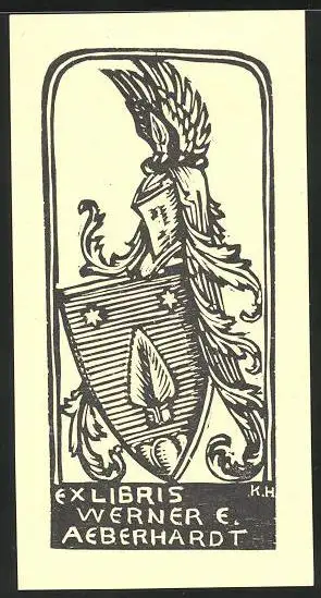 Exlibris Werner E. Aeberhardt, Wappen mit Ritterhelm und Pfeilspitze