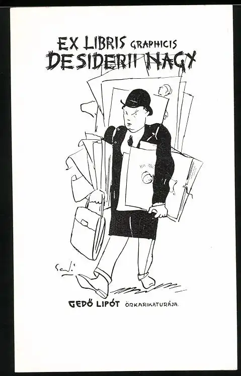 Exlibris von Gedö Lipot für Desiderii Nagy, wütender Graphiker schleppt Entwürfe