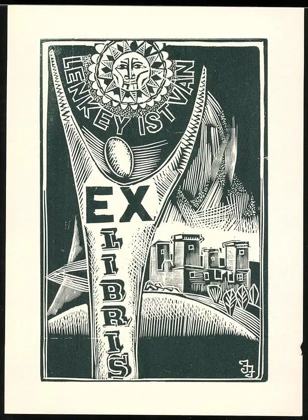 Exlibris von Janos Jozsa für Lenkey Istvan, Stabspitze mit Sonnensymbol über einer Festung