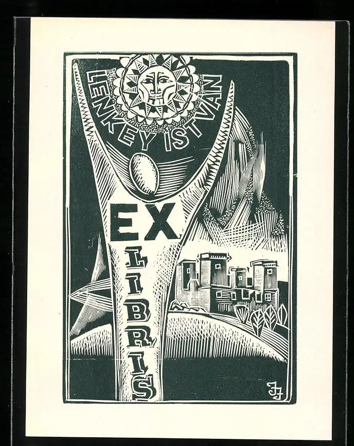 Exlibris von Janos Jozsa für Lenkey Istvan, Stabspitze mit Sonnensymbol über einer Festung