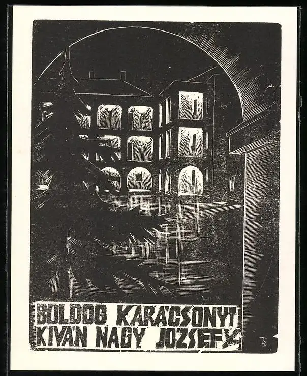 Exlibris von Tamas Banszky für Boldog Karacsonyt Kivan Nagy Jozsefy, illuminierte Gebäudeteile bei Nacht