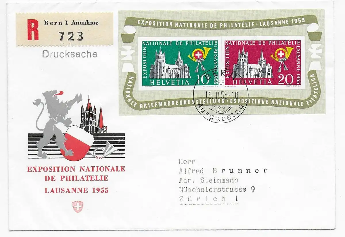 Exposition Nationale de Philatelie Lausanne 1955 Einschreiben Bern FDC, Block 15