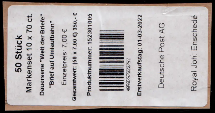 Welt der Briefe: Brief auf Umlaufbahn mit Produktnummer 1523 01005, Type I: Die 5 von der "50 Stück" steht über "en" von "Markenset"
