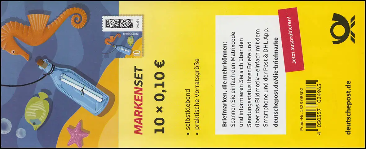 Postfrisches Folienblatt Welt der Briefe Flaschenpost Type I: rote Flächen der Bildseite (MARKENSET) MIT schwarzen Rasterpunkten, großes Markenbild 31 mm, Druckerei Bundesdruckerei Berlin (BDB)