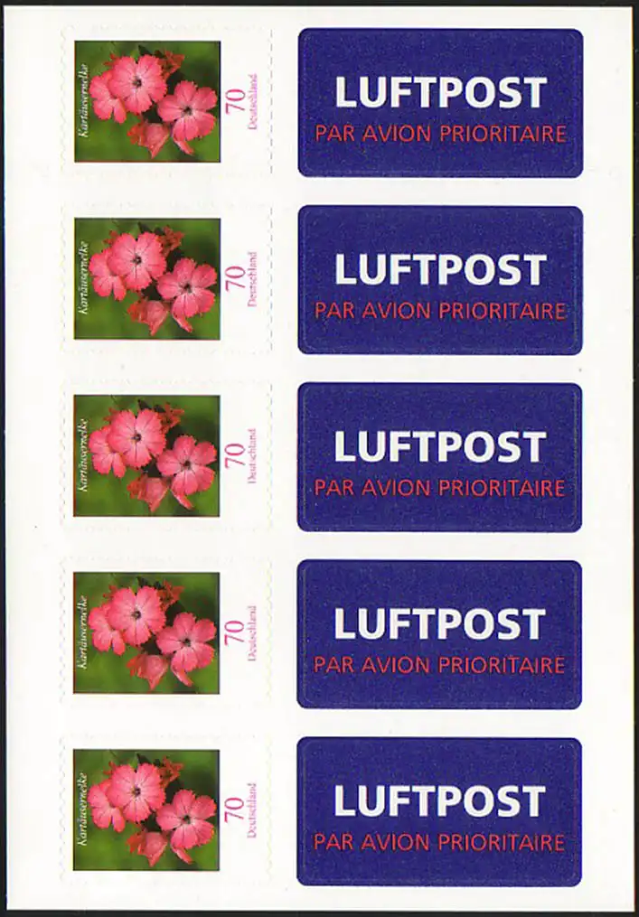 FB 3 Kartäusernelke 2009, Folienblatt 5x2716, mit Luftpost-Aufkleber **