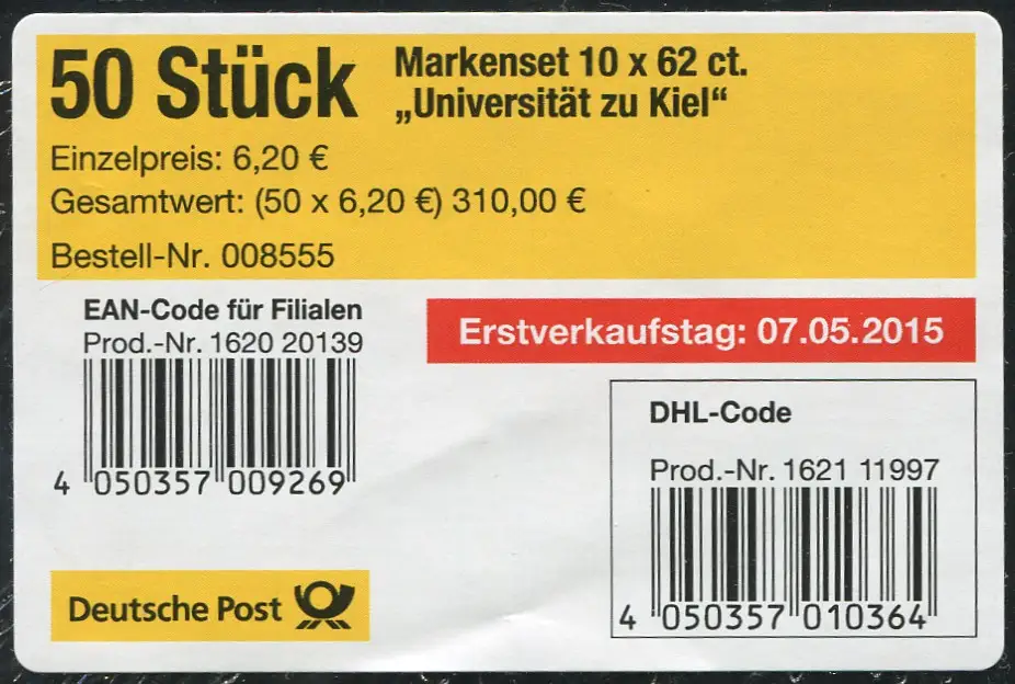FB 48 Universität Kiel, BANDEROLE mit DHL-Code für 50 Markensets
