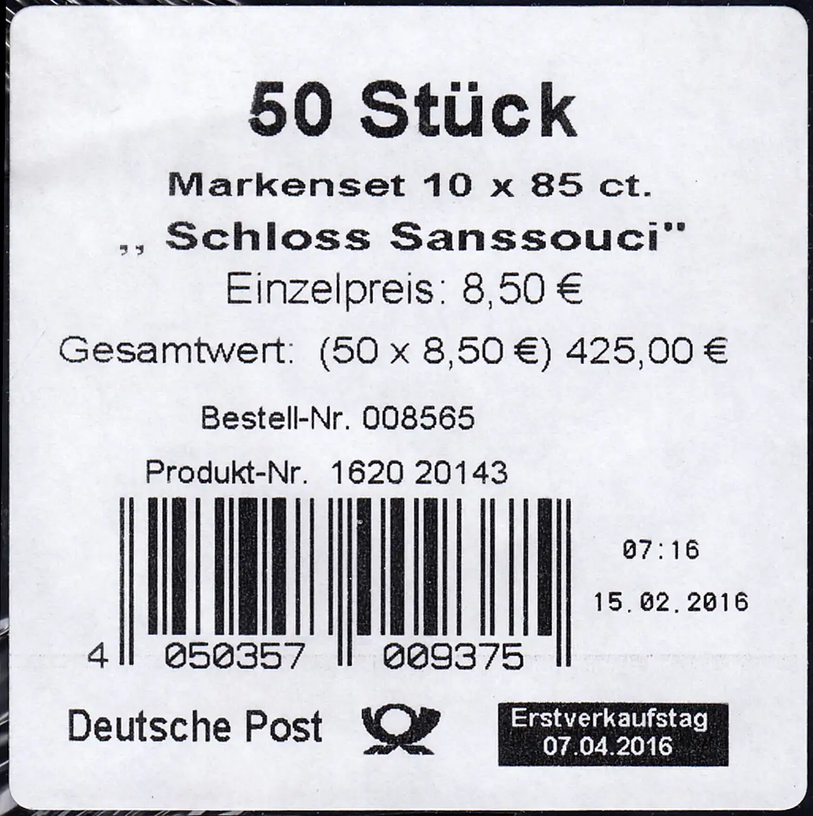 FB 56 Schloss Sanssouci, Folienblatt-BANDEROLE OHNE DHL-Code