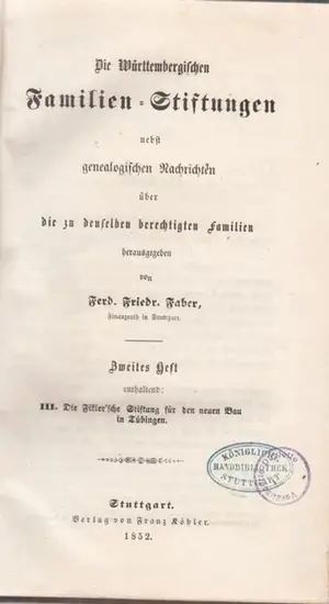 Titel: Die Württembergischen Familien-Stiftungen nebst genealogischen Nachrichten über die zu denselben berechtigten Familien. Zweites Heft, enthaltend: III. Die Fikler´sche Stiftung für den neuen Bau in Tübingen