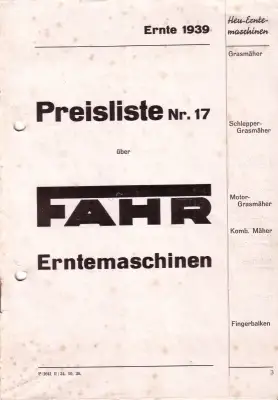 Fahr Erntemaschinen Preisliste 1939