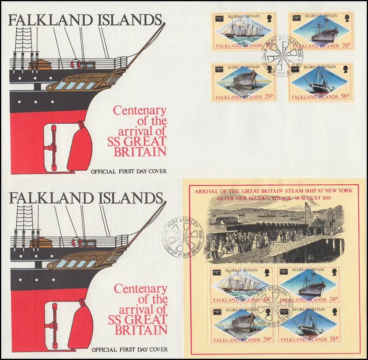 Falklandinseln 449-452 und Bl.6 AMERIPEX´86 Schiffe Great Britain auf zwei FDC
