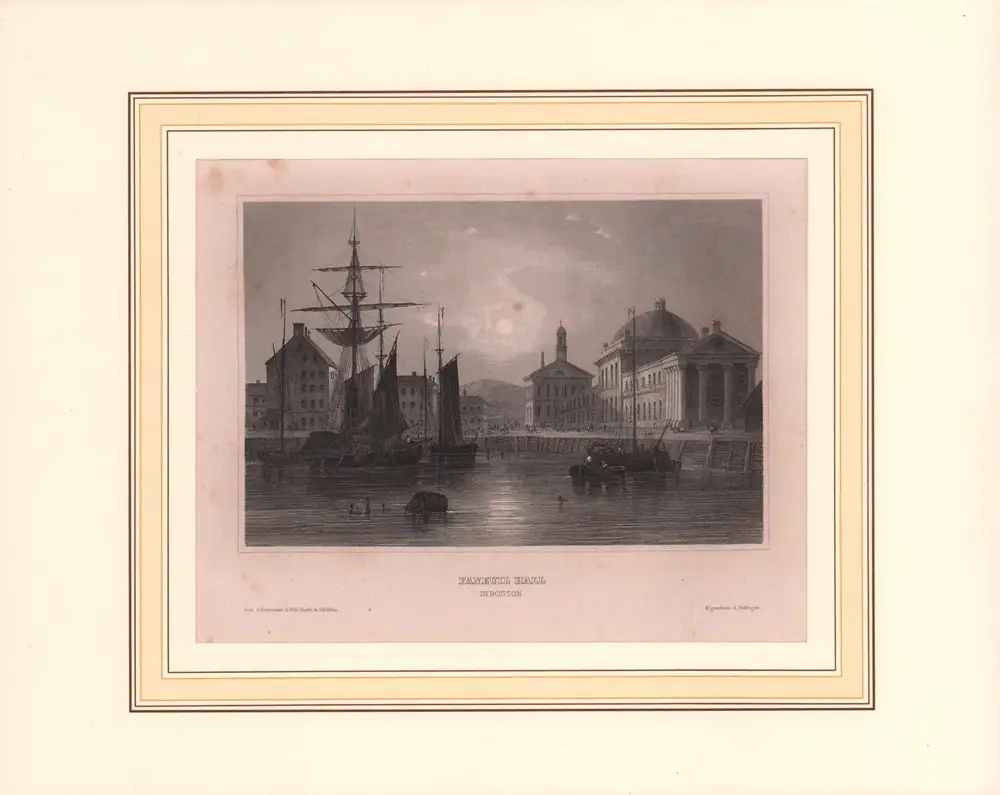 Die 1742 eröffnete Faneuil Hall in Boston, Massachusetts, benannt nach ihrem Stifter, dem Kaufmann Peter Faneuil (1700-1743), diente ursprünglich als Markthalle, später als Raum für politische Versammlungen. - Mäßig stockfleckig