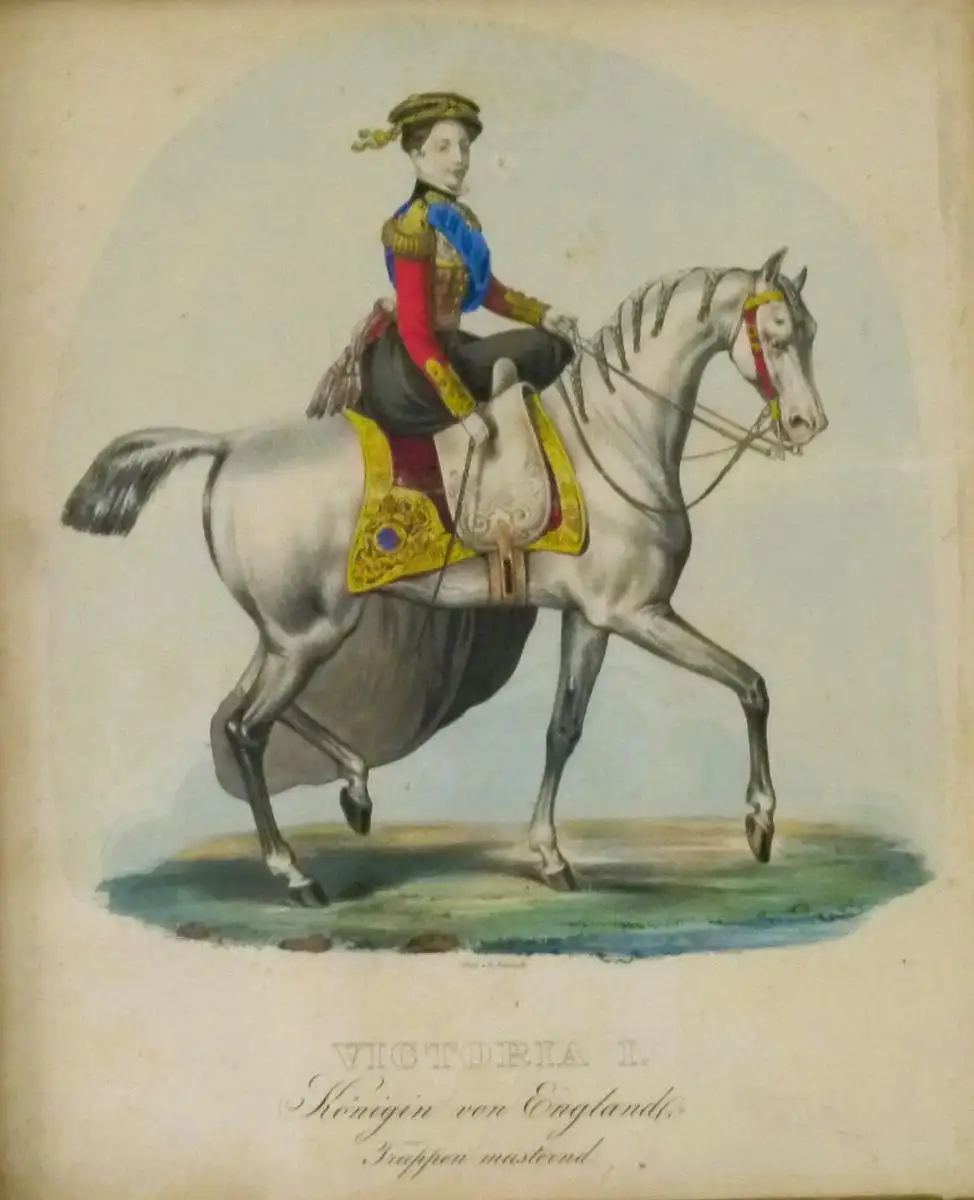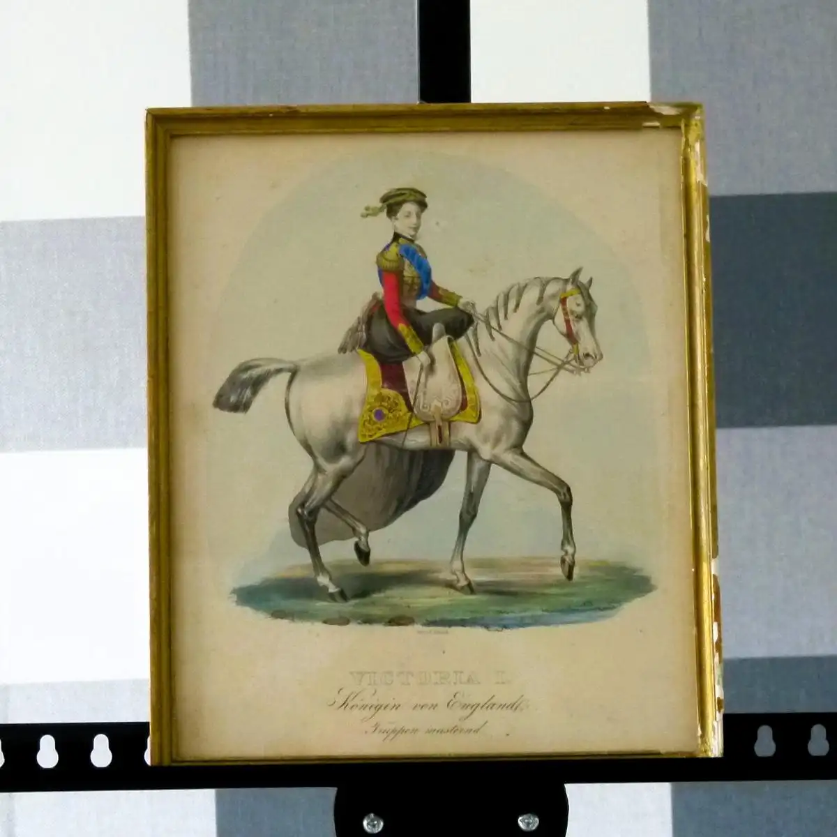 Farblithografie „Victoria I, Königin von England, inspiziert Truppen“ von A. Kneisel, ca. 1840, veröffentlicht von Güntz in Leipzig. Detailreiche Darstellung von Königin Victoria auf einem weißen Pferd während einer Zeremonie. Guter Zustand, Rahmen mit erheblichen Schäden (nur für Transport). Ideal für Sammler historischer oder königlicher Kunst.
