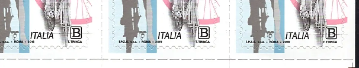 Fausto Coppi Sorten - Rechter Block mit Barcode - Radsport MNH - Block von sechs Exemplaren linke untere Blattecke mit Barcode - Drei Exemplare weisen Schleppstruktur zwischen ITALIEN und B auf - Gelegentliche Sorte Cod. 33/WEB