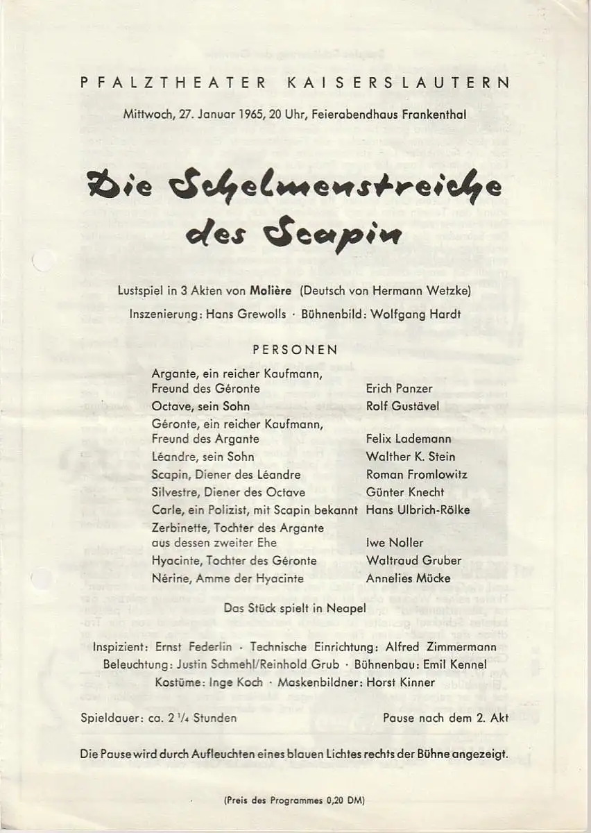 Feierabendhaus Frankenthal, Pfalztheater Kaiserslautern: Programmheft Moliere DIE SCHELMENSTREICHE DES SCAPIN 27. Januar 1965.