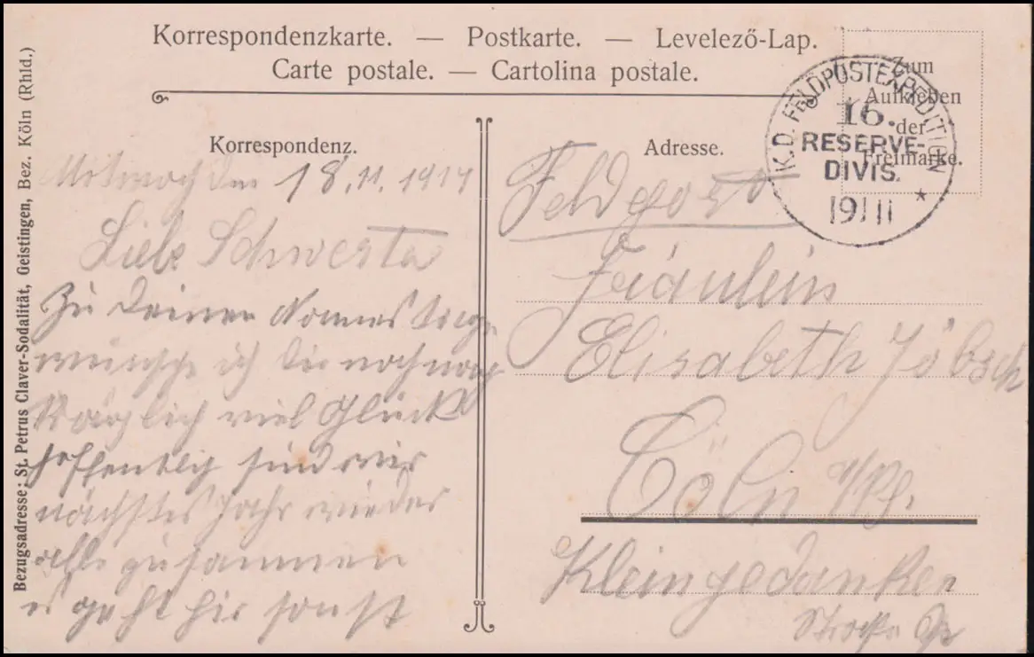 Feldpost 16. RESERVE-DIVISION 19.11.1914 auf AK Die Basuto sind geborene Reiter