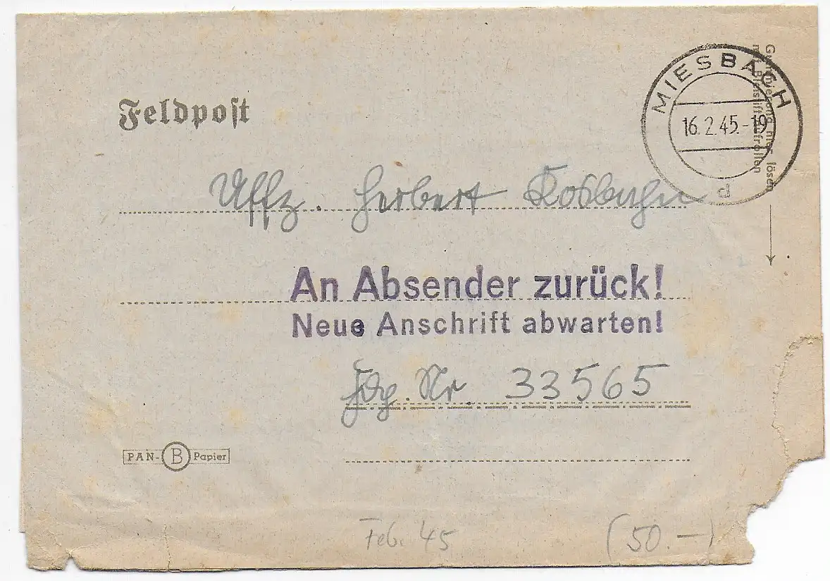 Feldpost: 16.2.45 Miesbach an FPNr. 33565