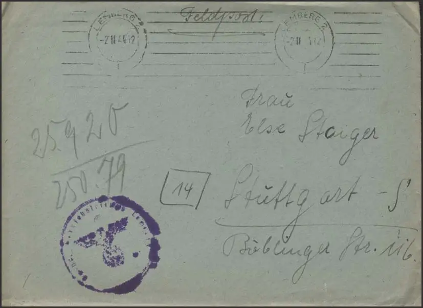 Feldpost 2. Weltkrieg aus Lemberg 2.2.44 mit B.S. Lemberg nach Stuttgart