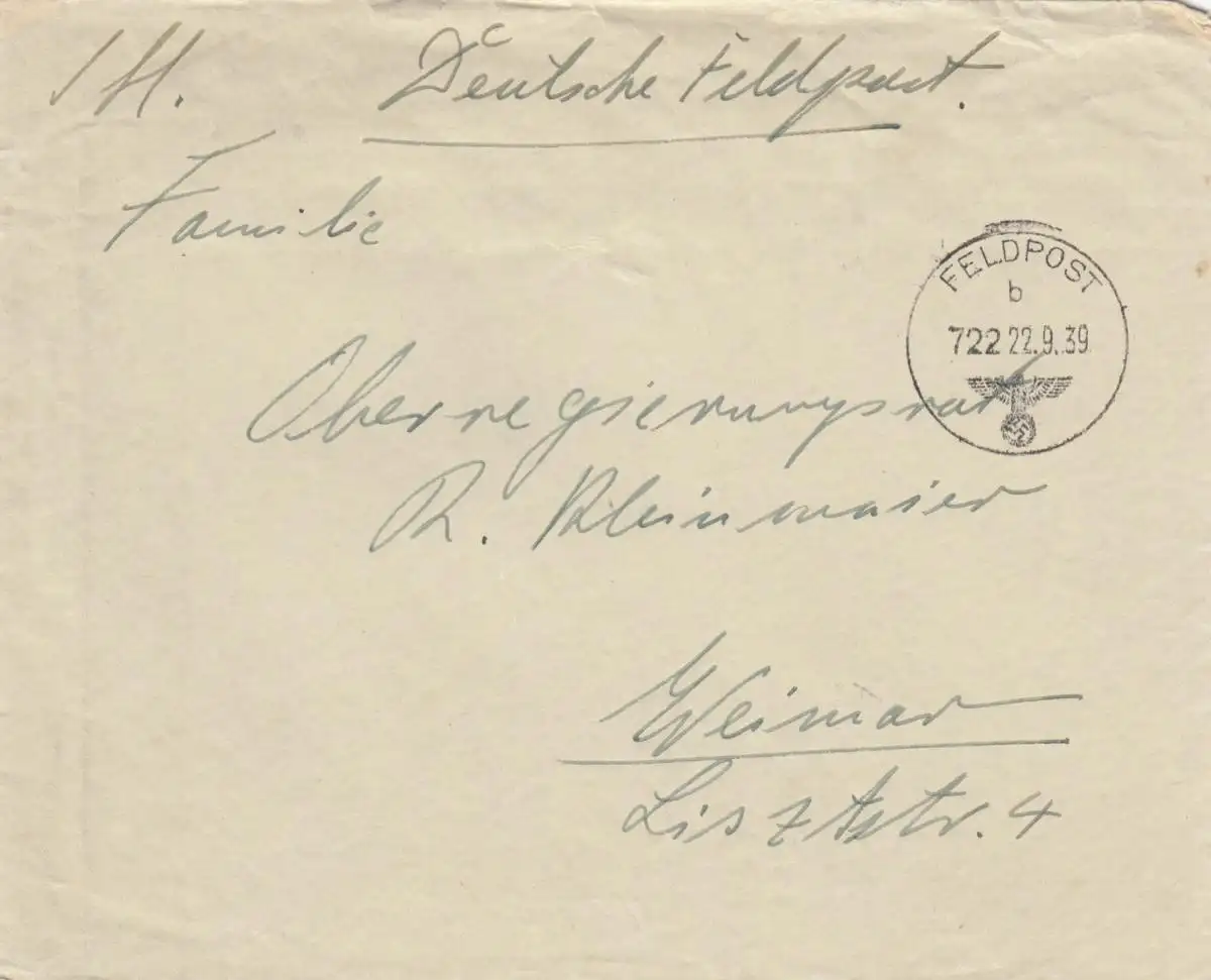 Feldpost 22.09.1939, FPNr. 10419 nach Weimar