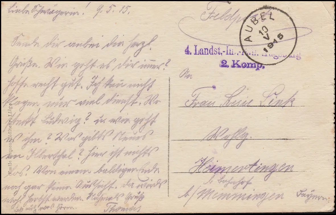 Feldpost 4. Landsturm-Inf. Augsburg, AUBEL 10.5.1915 auf AK Liege Lüttich