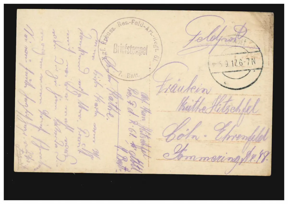 Feldpost 6.8.1917 Preuss. Reserve-Feld-Artillerie-Regiment 61 auf AK Liebespaar