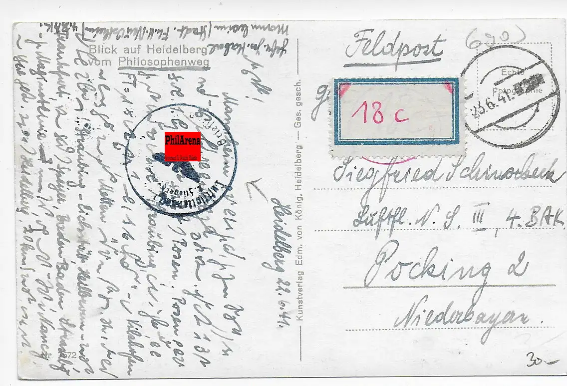 Feldpost: AK Heidelberg mit Stummem Stempel 1941 nach Pocking