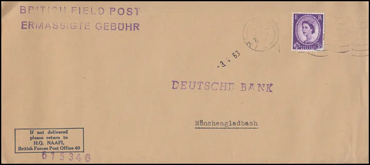 Feldpost BRITISH FIELD POST H.Q. NAAFI in Deutschland Brief F.P.O. 2.4.1963