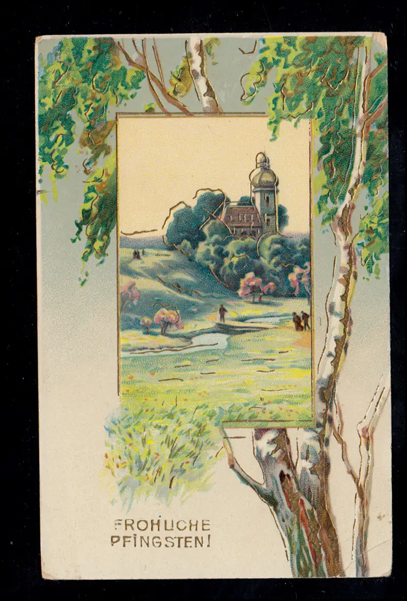 auf AK Pfingsten: Landschaft mit Kirche und Birken