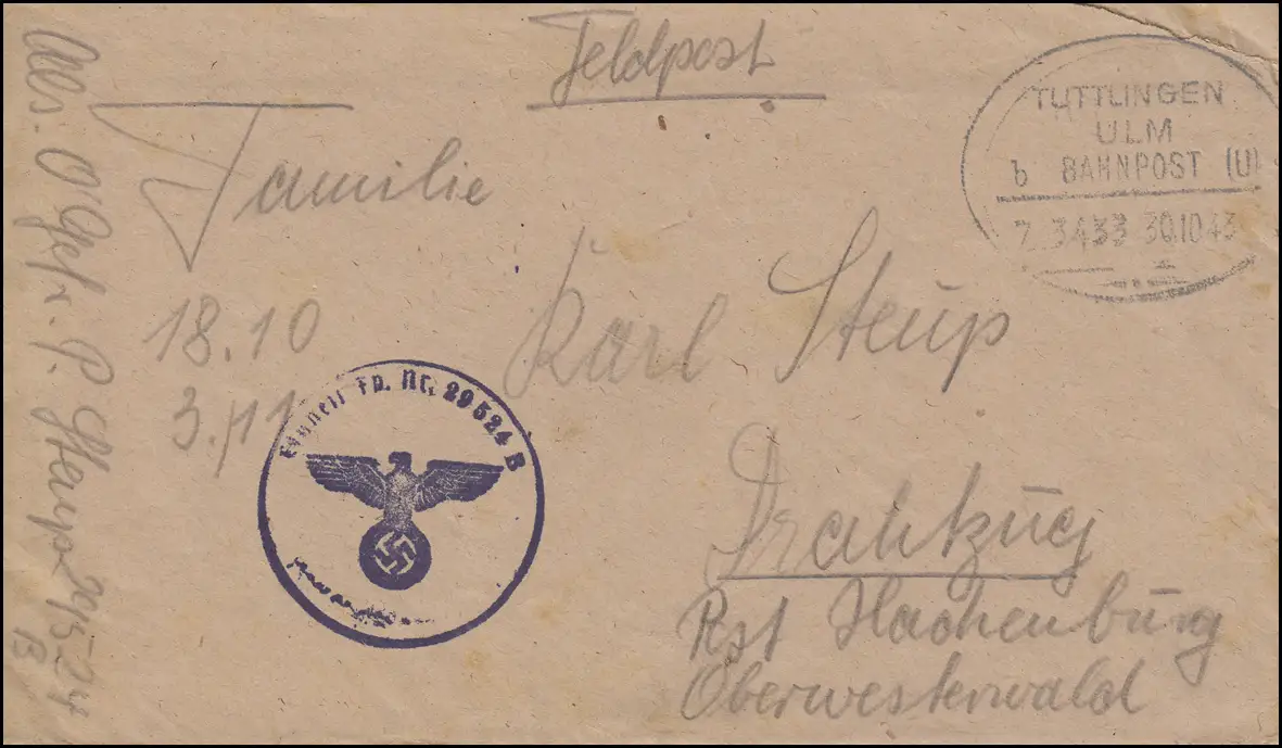 Feldpost BS FP-Nr. 29524 B, Brief mit Bahnpost TUTTLINGEN-ULM 30.10.1943