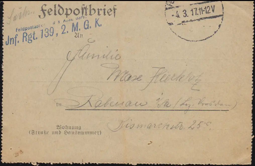 Feldpost BS Inf.-Regt. 139 2. MG-Kompanie Brief 4.3.1917 nach Rabenau/Sachsen