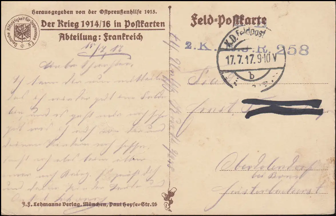 Feldpost B.S. J.R. 258 - 17.7.17 auf Propaganda-AK Frankreich Bruyeres bei Laon