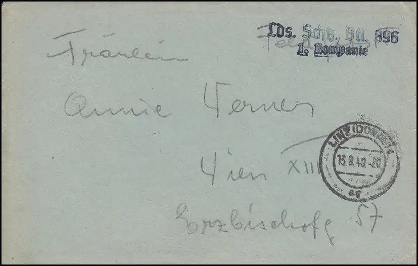 Feldpost Briefstempel Lds. Schützen-Btl. 896 1. Kompanie auf Brief LINZ 13.8.40